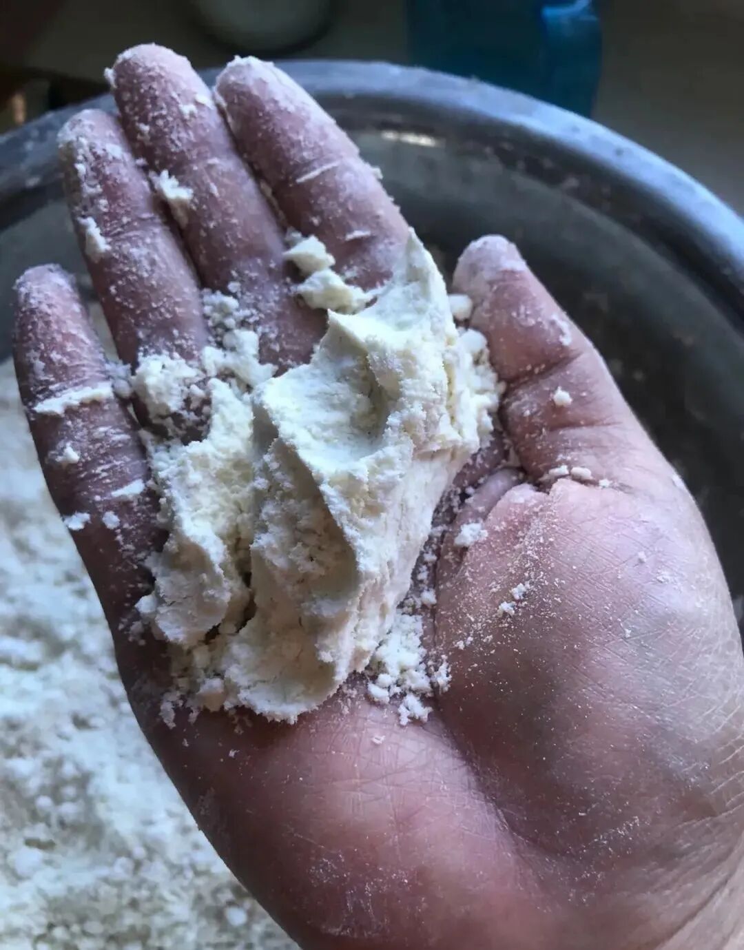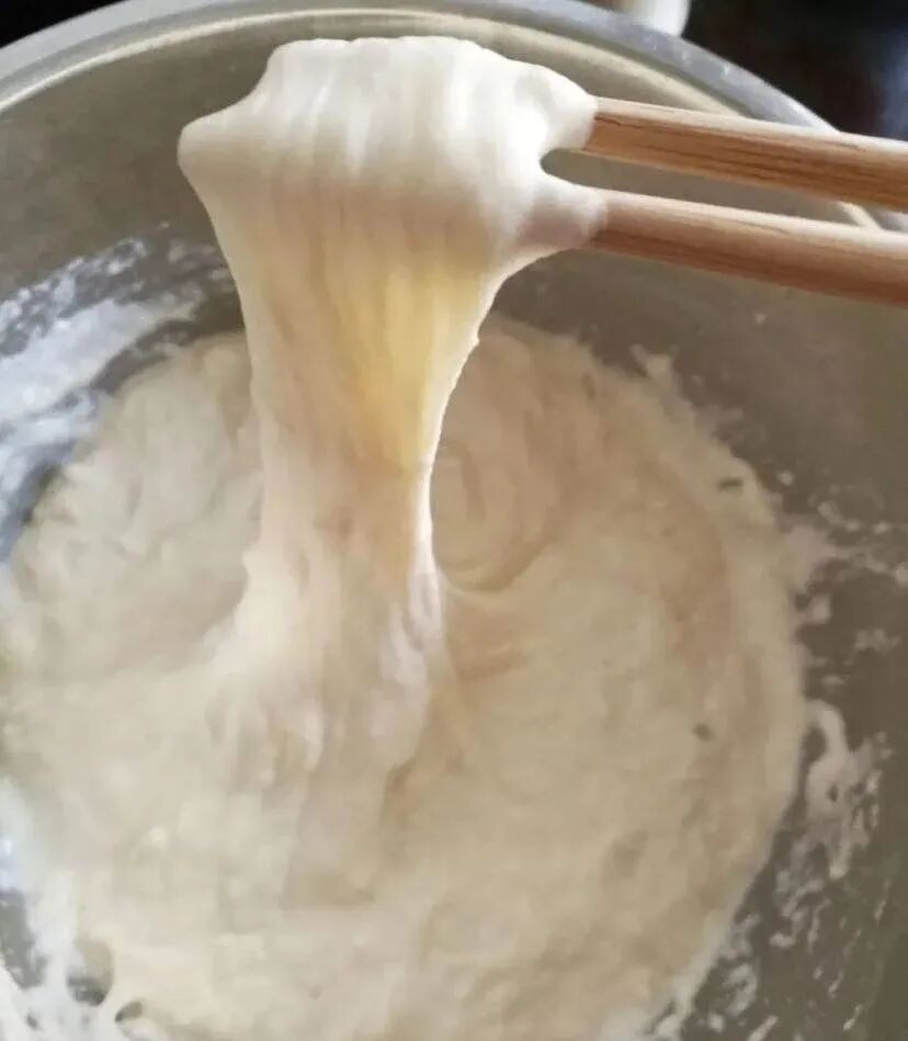 中筋面粉指的是蛋白质在9.5%至11.5%之间的面粉,这种面粉的颜色看起来有些乳白色的样子,用手抓一下,会稍微凝聚成团。