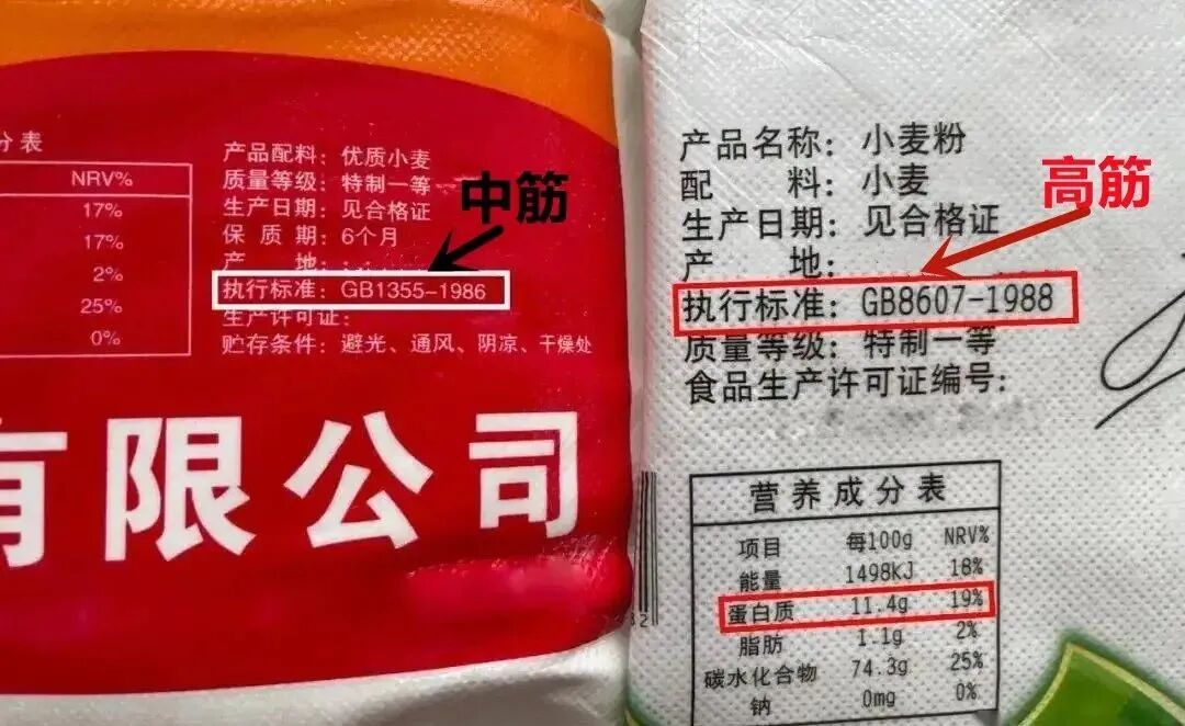 现在很多面粉的包装上,并没有直接标注出这是高筋面粉,所以,最好的方法就是通过包装上的执行标准来辨别!高筋面粉的执行标准是GB/T8607!