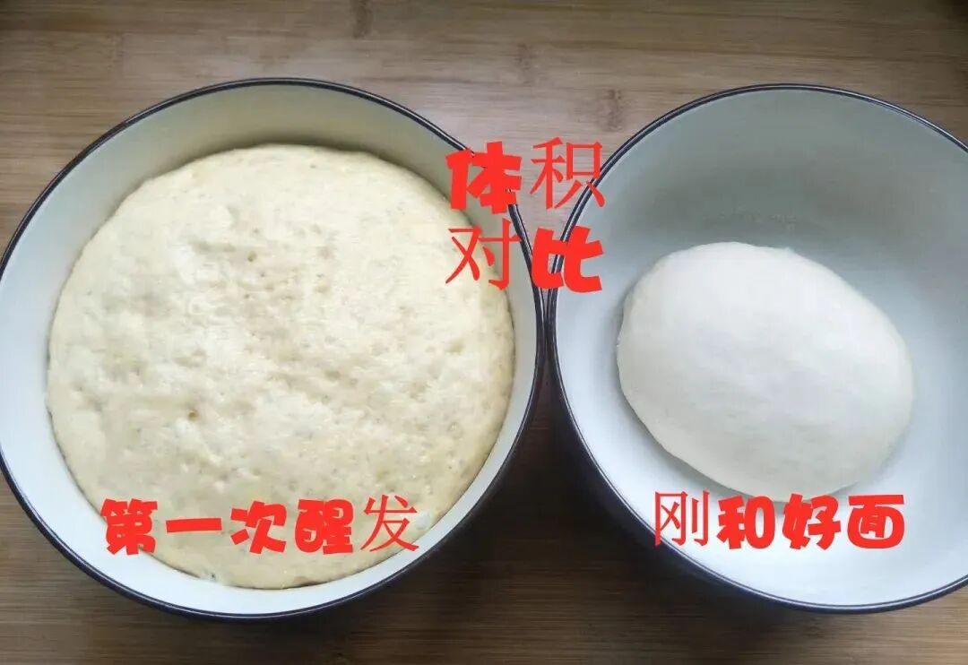 其次,还可以通过观察法通过体积的大小来判断面的醒发度!一般来说,醒发至原来体积的2倍大小时,则表示面团已发酵到最佳的状态;如果超过2倍多的体积,则表示面发大了,做熟的馒头味道会发酸;如果是体积不足2倍,则表示面团还没有发酵好!