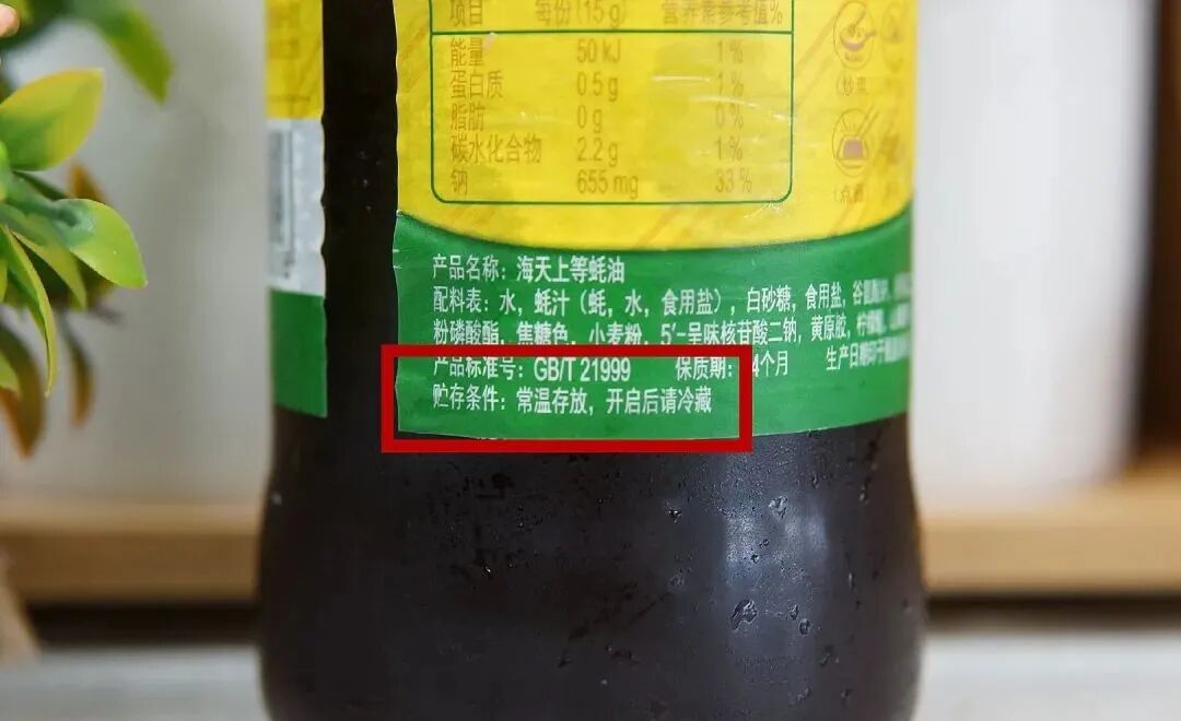 这样的做法是非常错误的!请大家注意,其实,每一瓶蚝油瓶上都会有标注,开启后请冷藏!注意是冷藏,不是常温存放!因为,开启瓶盖后常温存放,蚝油的保质期就会很短,让人不知不觉中吃到变质的蚝油!