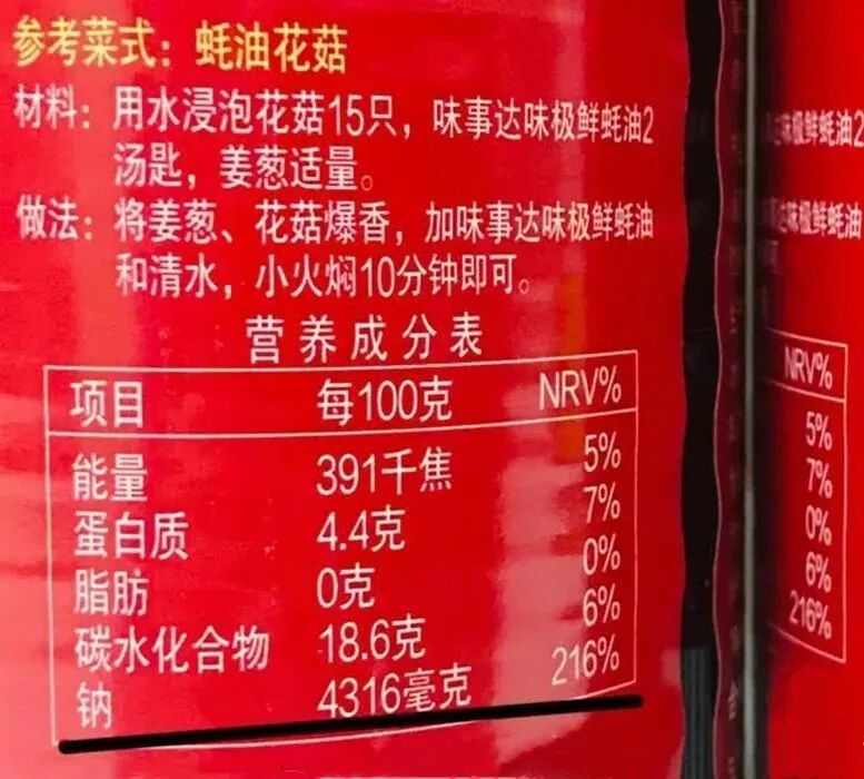 1克盐大约等于400毫克钠,而有些蚝油,100克就含有4000多毫克的钠,大致等于10克盐的用量!要知道,成年人每天盐的摄入是6克,虽然炒一次菜不能加100克蚝油,但别忘了,一天三顿饭,还有其它的菜肴,所以,很容易钠元素摄入过多。