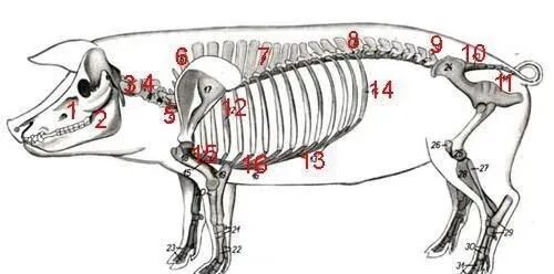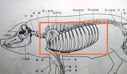 猪前排主要集中在靠近猪前腿位置的那四根排骨;猪后排主要是集中圈出来的排骨中的后面8根;猪中排就是剩下的中间排骨了。