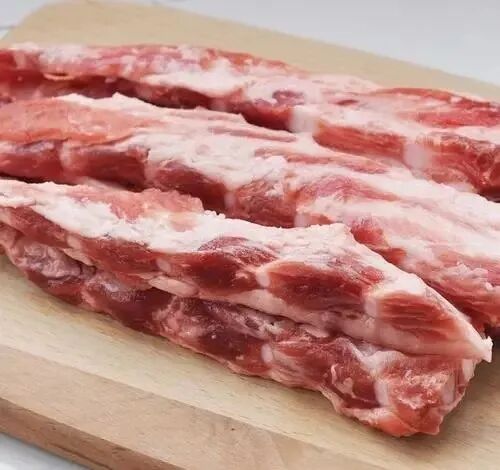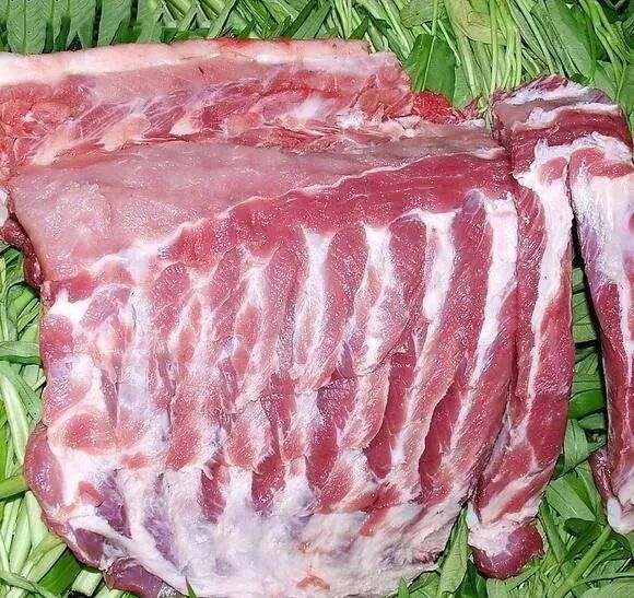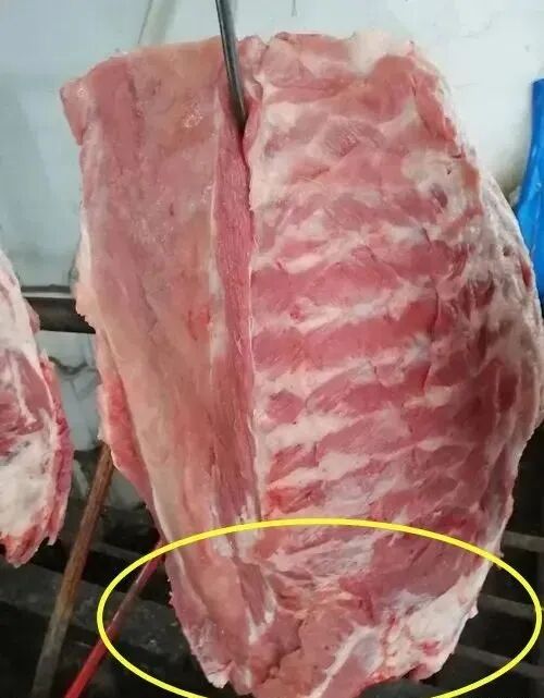 我们管猪后排也叫“后八根”,整体看上去是一字型的形状,骨头尺寸比前排长且大,肉偏多,肥瘦区分明显。