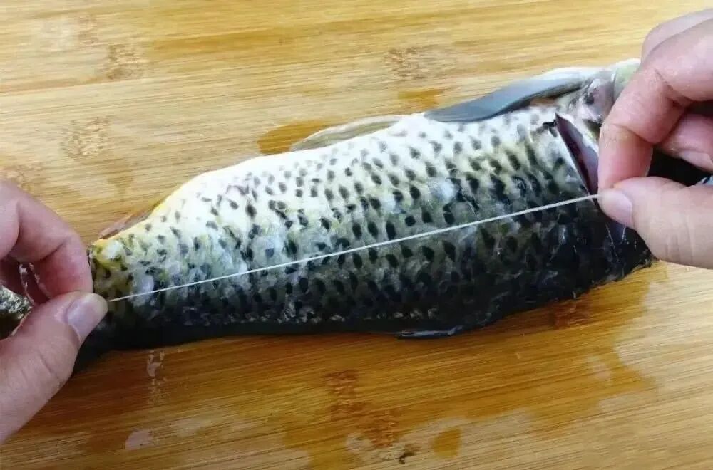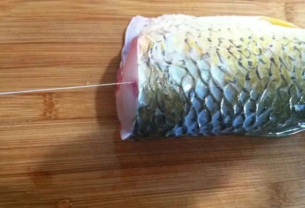 接着,再用刀背平拍鱼身几下,然后在鱼头或者鱼尾的刀切面上,你会发现一个小白点,用手指甲捏住这个白点,往外拉动,就会拉出一条白色像头发一样细的鱼腥线!这个方法简单又实用,大家可以回头试一试!