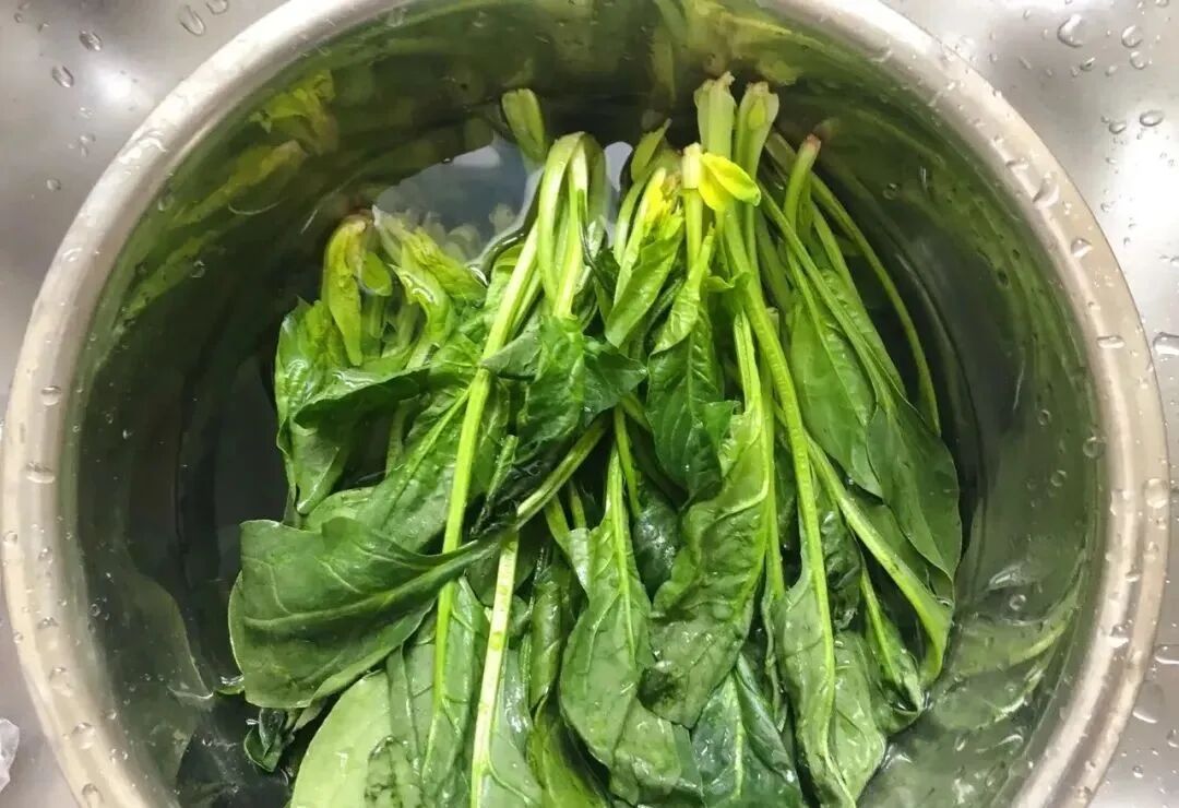 步骤一:新鲜的菠菜只需要去掉腐叶和枯萎的叶子即可,然后带着根茎冲洗干净,有时间的朋友,还可以在水中放入2勺小苏打,搅拌均匀后把菠菜浸泡一下(同样也是为了去除农药残留)。