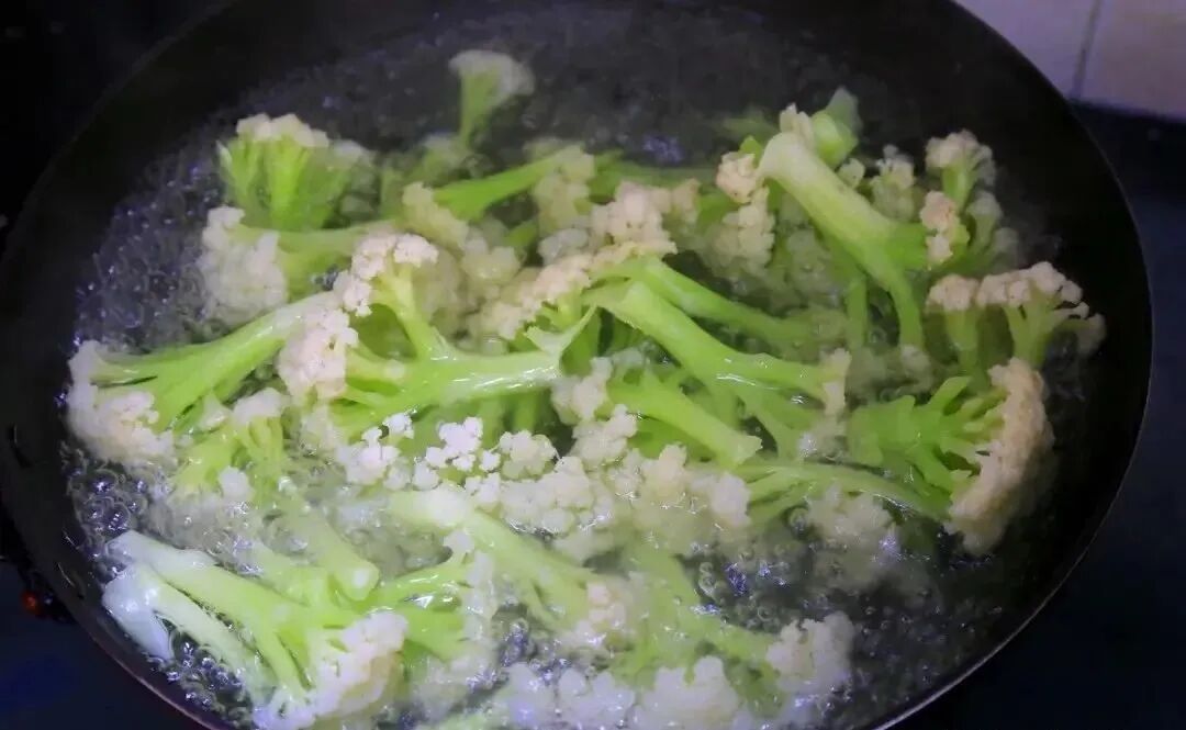 步骤二:把切好的花椰菜洗净后,放入锅中焯水;焯水时放入2勺食盐,一点点的食用油,这样焯完水的花椰菜颜色鲜艳;焯水的时间不要太长,一般2分钟左右即可。