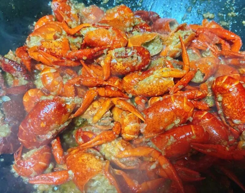 4、另起锅,放入一块黄油,融化后倒入2/3的蒜泥,大火炒出香味,加入适量白糖提鲜,倒入炸好的小龙虾快速翻炒,充分吸收蒜香味。
