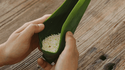 米装好后,再把两边的粽叶向内内折,然后将上面的粽叶向下折,一直折到开口完全盖住为止。最后,把剩余的粽叶顺着各自的方向,依次折好即可。
