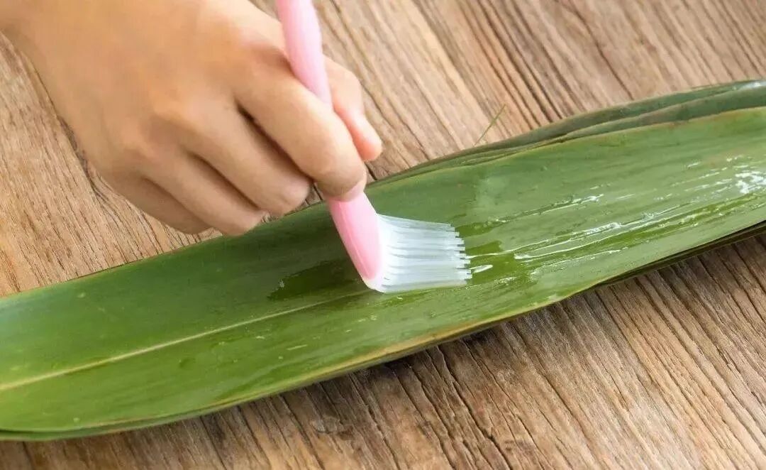 包时先刷油:很多朋友粽叶泡好后,就直接装米包了!但煮熟之后却发现,自己做的粽子味道可以,但就是粽叶与糯米粘连在一起,吃起来比较麻烦。所以,在包的时候 ,要先在粽叶上,刷上一层熟油。