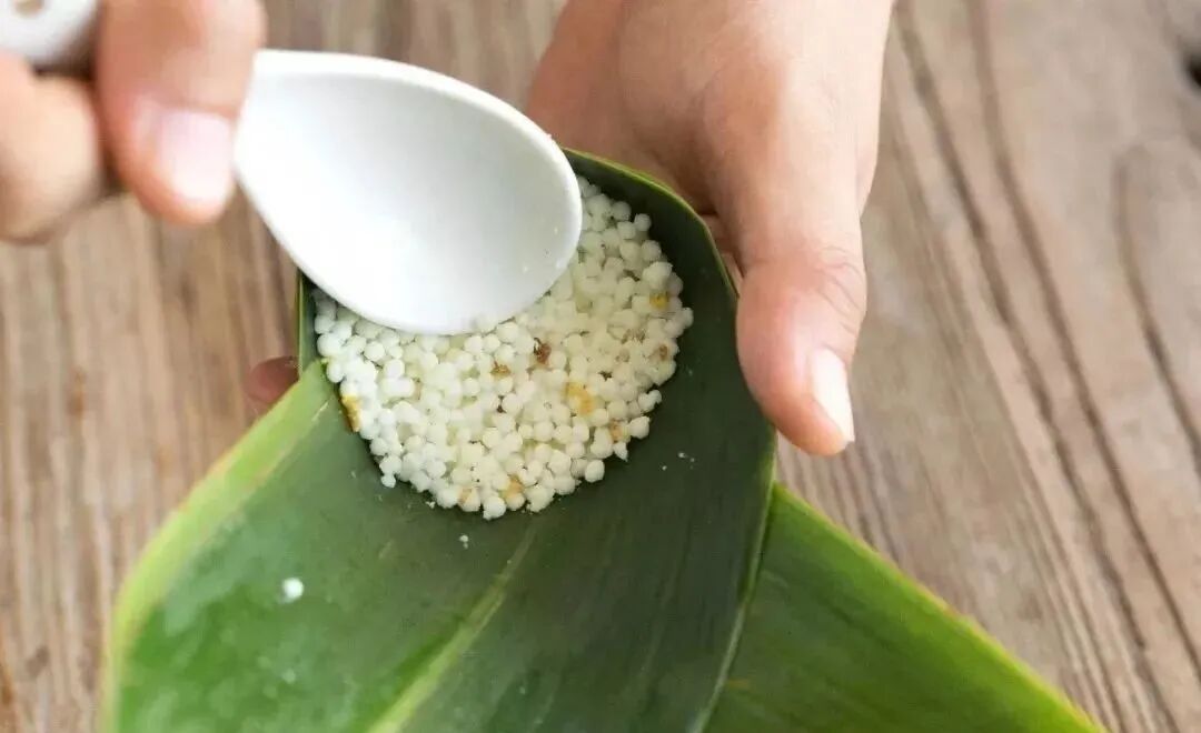 装米的时候,切记不要装满,因为粽子在煮的过程中,内部的糯米还会吸收水分,这样糯米的体积就会膨胀,如果装得太满,米就会溢出!