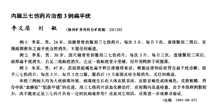 比如扁平疣,扁平疣也可以看作是身体不能推陈出新的结果,三七活血,加快气血流通,把陈旧的迂腐的东西带走。