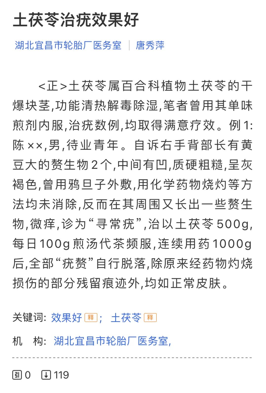 医案二:一个四岁的小男孩,疣子长在了脸上,而且还不少,从脸颊到耳前有十多个,大家知道人的这个脸面是非常重要的,再加上小孩子皮肤娇嫩,外用药轻易不敢使用。他的母亲为此忧心不已,带着他四处求医。中医大夫开出的方子很简单,也是用土茯苓煮水喝,两个月以后,疣子一个不落,纷纷脱落。