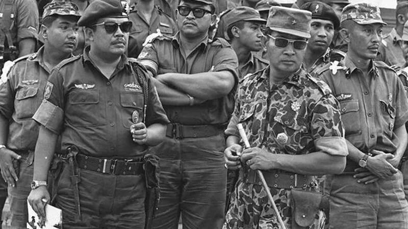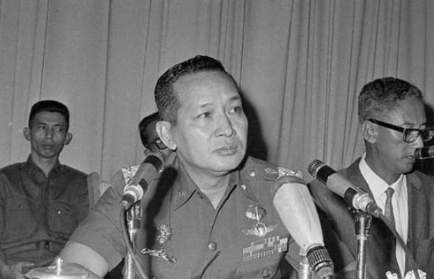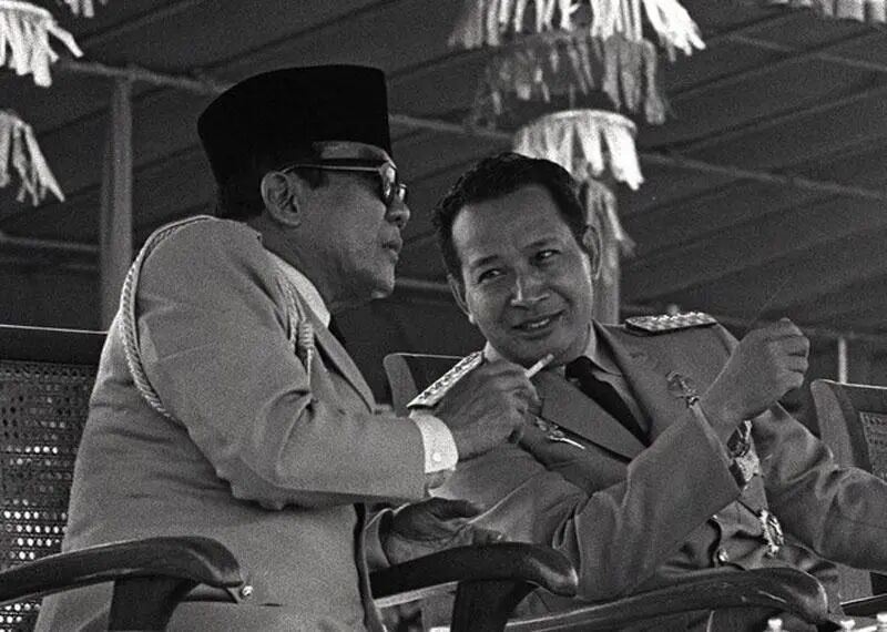 1965年9月30日,印尼发生了军事政变,军队逼宫,强迫“亲中”的总统苏加诺解散国会并下台,当时还是印尼陆军战略后备部队司令的苏哈托,立即“率兵勤王”,迅速平息了政变,但他并没有将权力交还给国会和苏加诺,而是“黄袍加身”,自己宣读了一份“命令书”,宣告在“军方的拥护下”,出任代总统。
