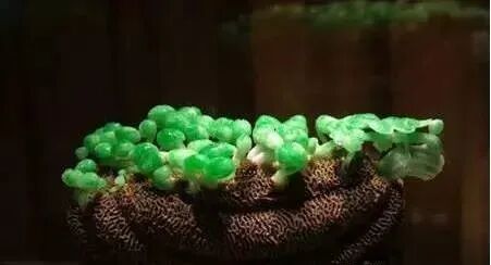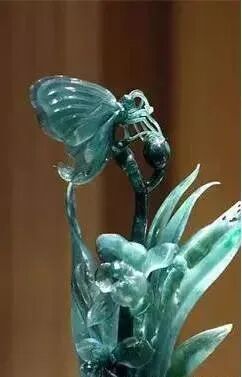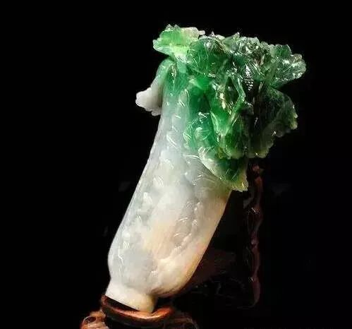 翡翠西瓜四枚,白皮黄籽粉瓤者两个,绿皮白籽黄瓤者两个,翠桃10个,翡翠白菜两颗,绿色的菜叶旁有两只典色的马蜂。