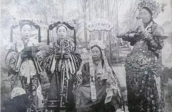 最经典的一张是:扮成观音菩萨的西太后,一脸庄严神圣的模样,坐在正中。她的左边,李莲英扮成韦驮天尊。她的身后,侍立着两名少女,一个捧着经书,一个捧着香炉。