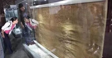 盖在慈禧尸体上的是一条织金的陀尼经被。被长280厘米,宽274厘米明黄缎底,捻金织成。经被上缀有820粒珍珠。在经被之上又盖一层缀有6000粒珍珠的网球被。