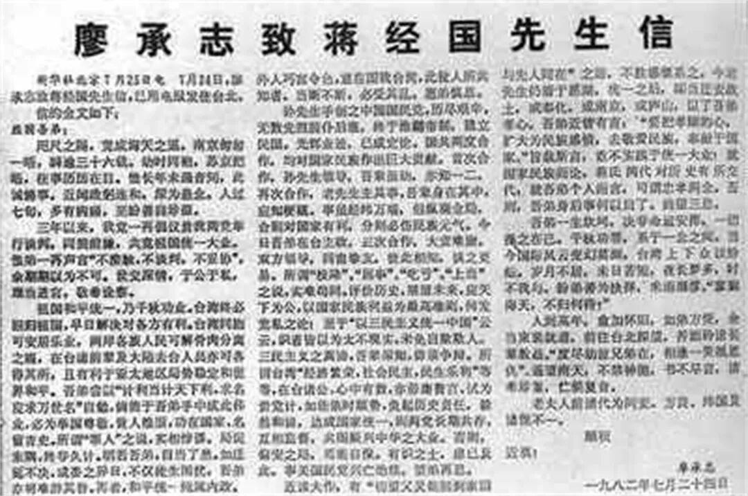 为了让更多的台湾同胞看到这封信,廖承志还委托自己的好友,借着台湾报检一目十行的习惯,以《国共昨互促统一,双方仍各言其志》,以及《廖承志函请蒋经国三度合作》为名,经过特殊处理,刊印到了香港中间报纸《星岛日报》以及《华侨日报》中,转送到了台湾。