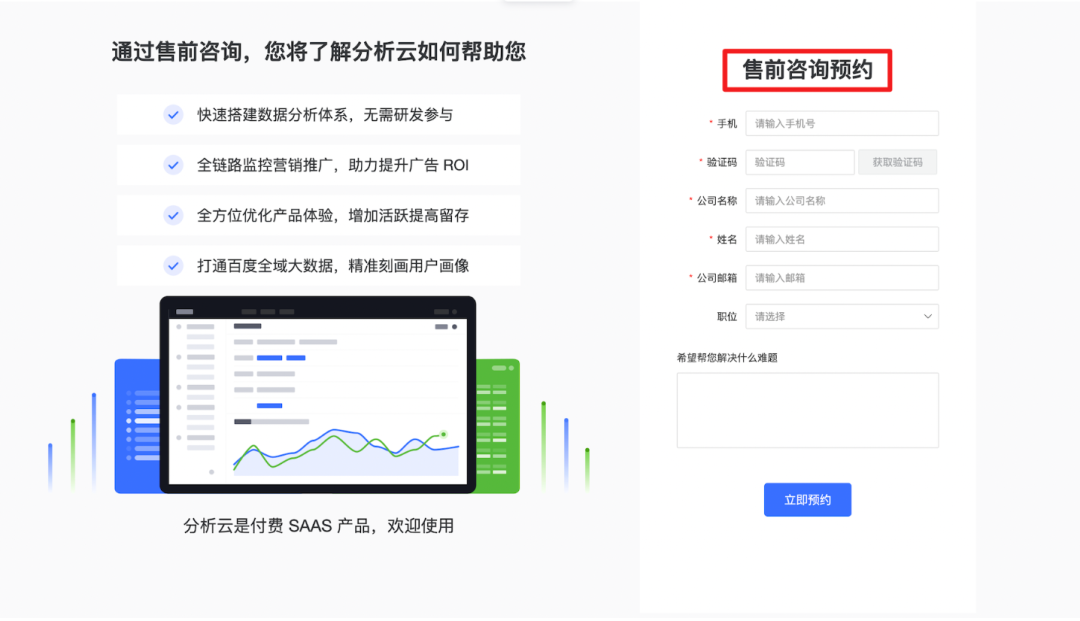 业务背景:百度统计的运营同学想提升留资页的留资转化率。他们觉得留资页表单的表头付费的意思太过于明显,可能会吓退一些客户,因此他们打算对留资页的标题进行A/B测试。