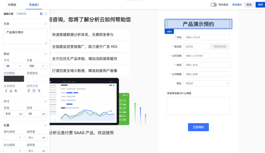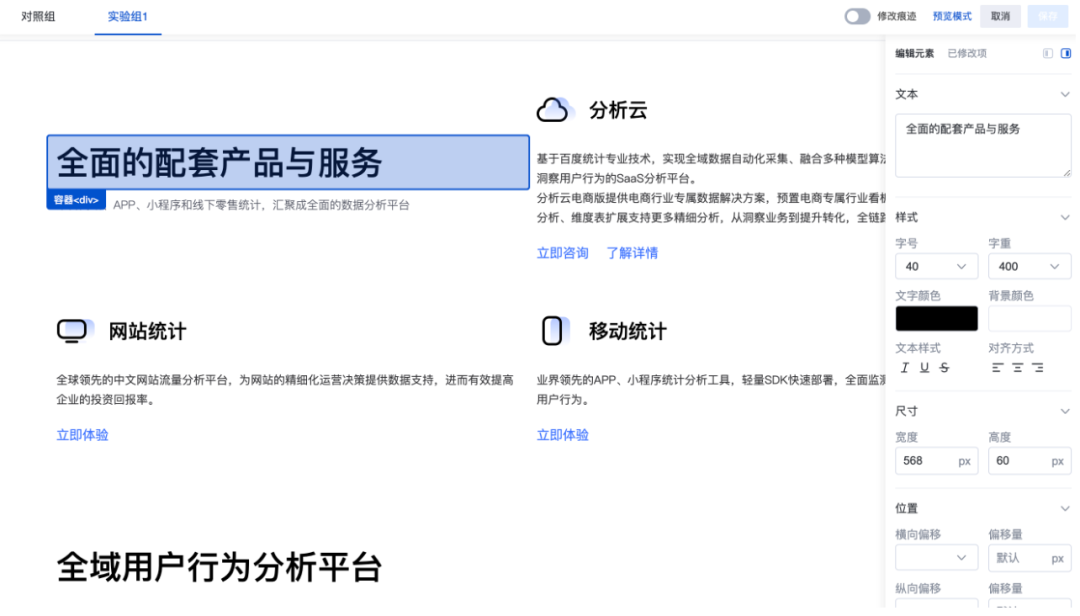 百度统计「可视化A/B实验」功能能以可视化的方式展现要修改的页面,您可以在其中圈选您想要修改的元素,圈选后即可对元素的内容、样式、边框、位置等进行修改。修改完后可立刻上线A/B实验。