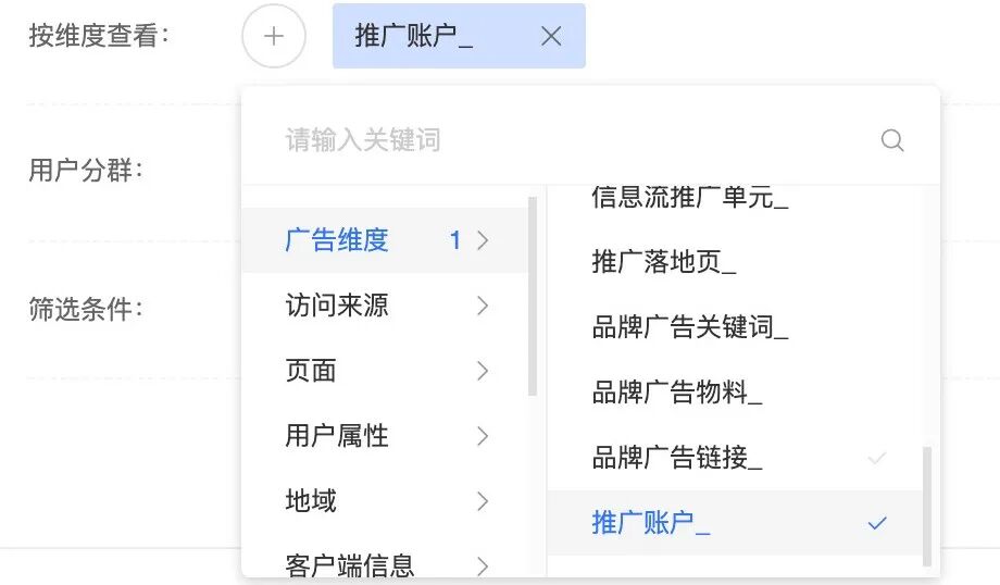 增加「推广账号」维度,支持对比分析不同推广账号的数据表现。