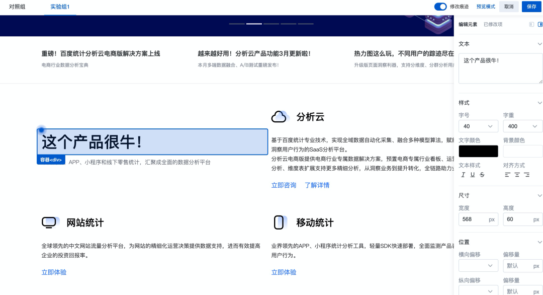 支持可视化上线A/B实验,无需开发,运营同学即可手动修改组件信息,上线前端实验。方便快捷,极大降低研发成本,加快实验上线流程。