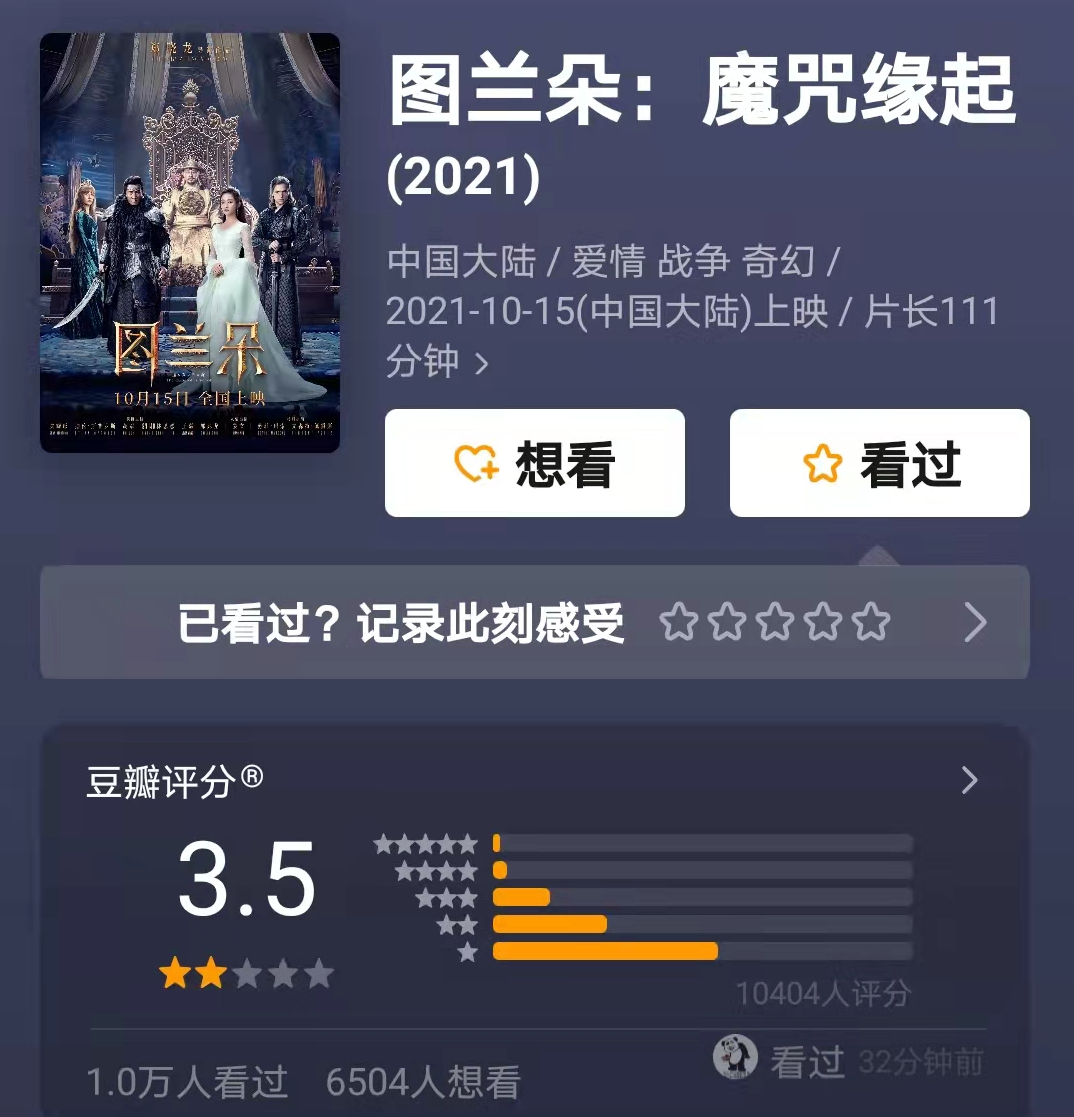 比如视效方面,《图兰朵》因为在2018年就杀青,积压3年,视效早已过时,只有当下网络大电影的水准,让想体验视觉盛宴的观众乘兴而来,败兴而归。