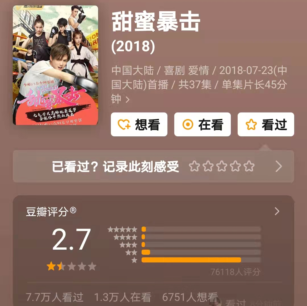 关晓彤参演电影的豆瓣平均分还不到4分,和男友鹿晗一起主演的电视剧《甜蜜暴击》的评分更是只有2.7,被人称为“夫妻废片”。