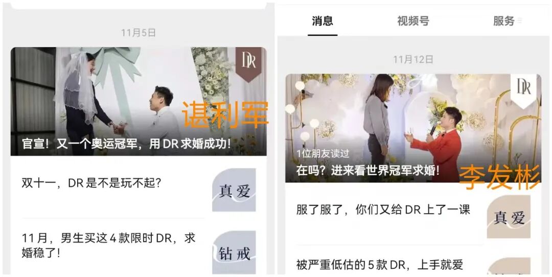 从8月到10月,DR钻戒公众号一共更了10篇头条文章,有4篇都是奥运冠军用DR求婚。