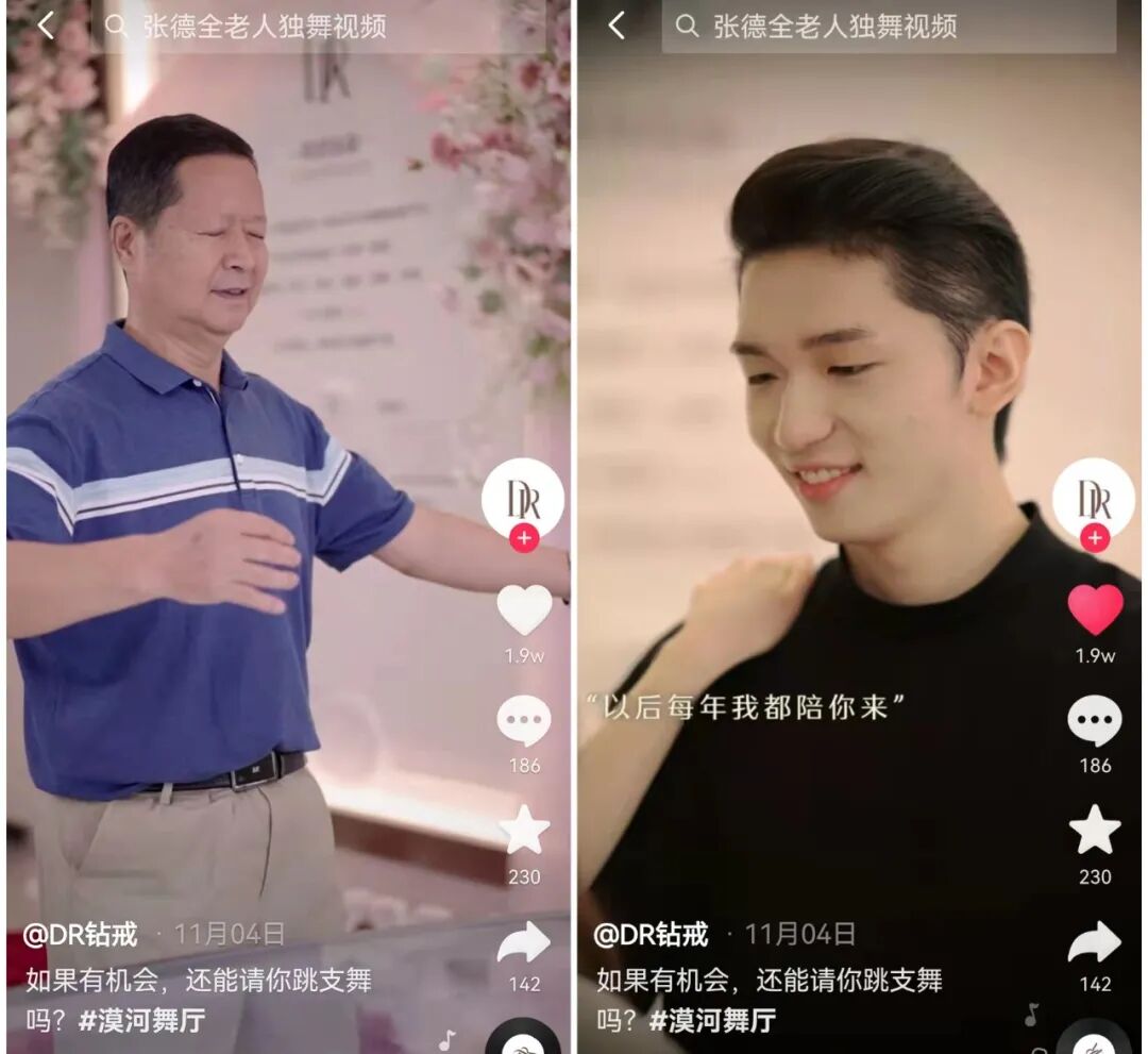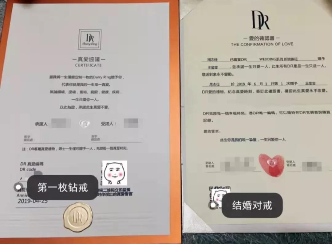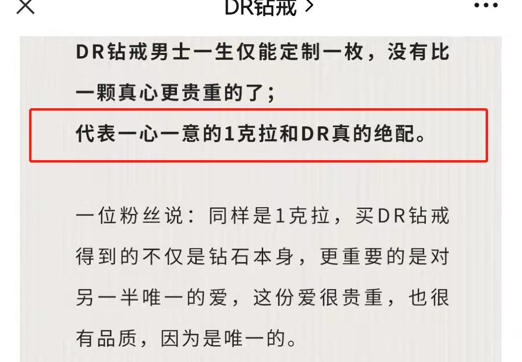 只要有“一”这个字,不管是“唯一”还是“一生一世”,哪怕是“第一桶金”、“第一次哭”,DR都能用来蹭爱情的热度:“男孩子第一次哭,是在签订真爱协议的时候,他的第一桶金、第一笔工资都用来买DR。”