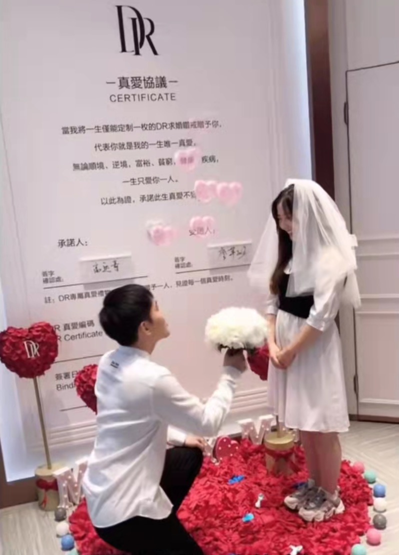 在DR门店,有大块的承诺墙、花墙、照片墙,鲜花、头纱一应具全,全是给情侣求婚用的,没准备好被围观,就别去DR了。
