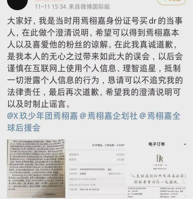 多亏明星们的公司也不是吃素的,很快当事人就站出来道歉,说明自己冒用了爱豆的身份证号,给自己买了钻戒,锁上了他的“真爱名额”。