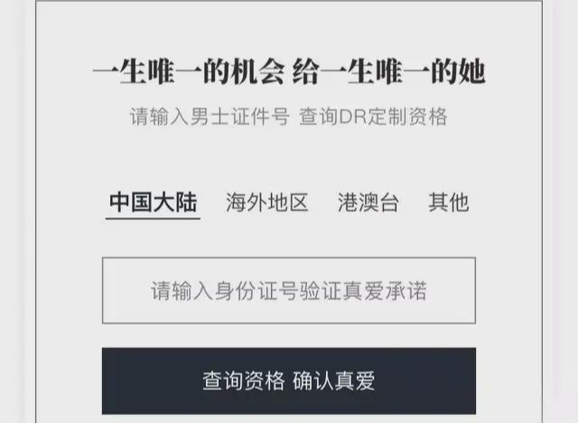 每个男人只能给同一个女人买,要是换了人,柜姐会说:“不卖第二枚是DR的底线,你不能把爱错当理由。”