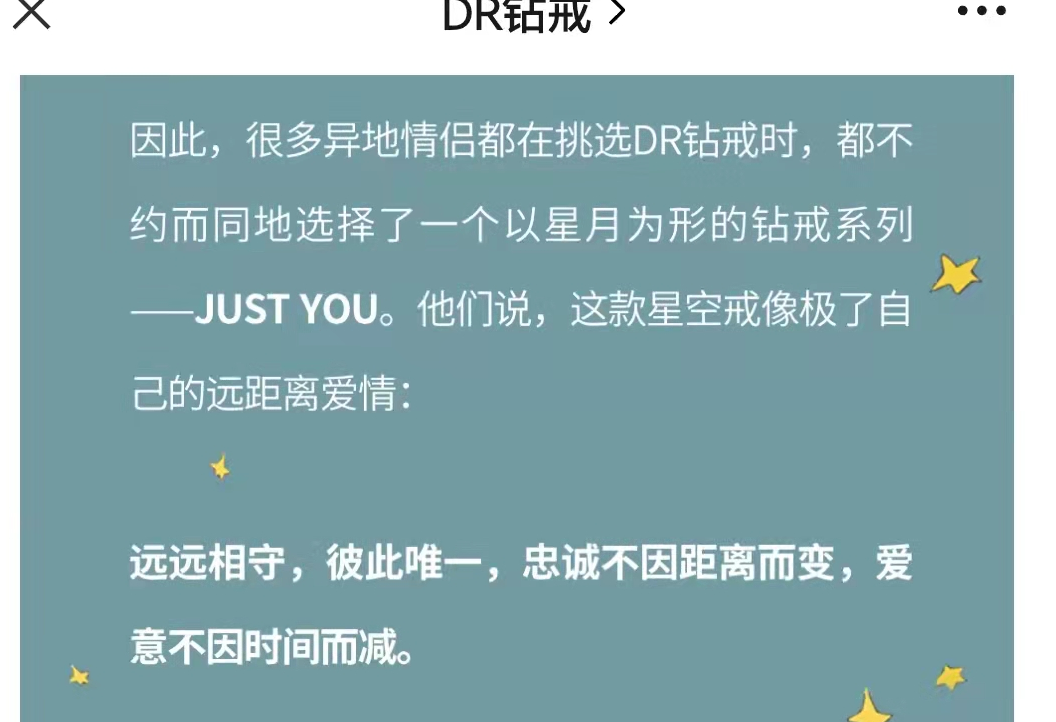 DR永远都能用真爱桥段,把故事的男女主角转移到DR钻戒上:“吃过异地恋的苦,都拒绝不了这款DR钻戒,JUST YOU系列,远远相守,彼此唯一。”