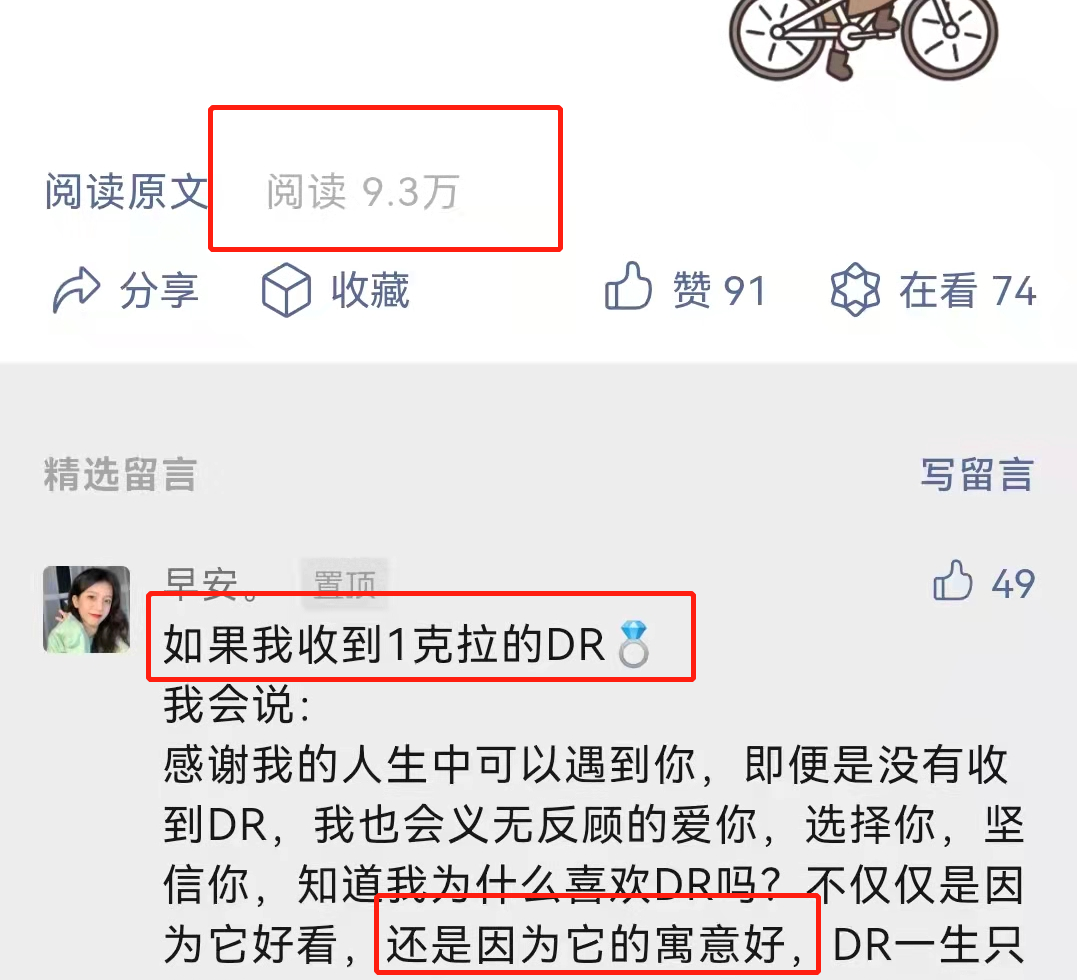文章《一克拉钻戒,凭什么非要买DR?》阅读量过9万,下面全是粉丝的真爱留言。