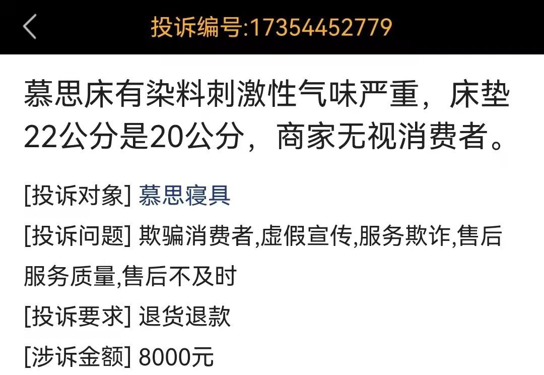 另一个涉诉金额8000元的投诉中,消费者测量慕思床垫尺寸与宣传不符,且因气味刺鼻,怀疑该慕思床垫甲醛超标。