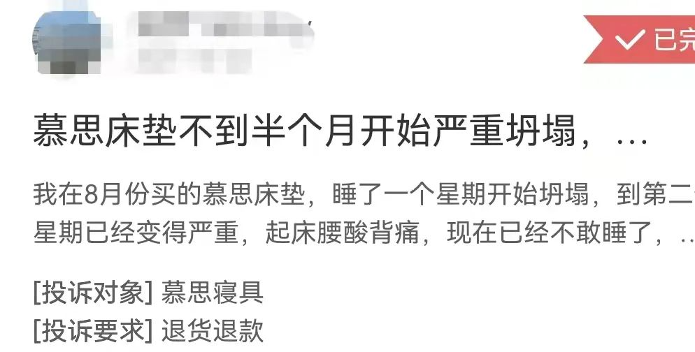 其中一个投诉显示,某顾客的慕思床垫在购买半个月内就出现变形坍塌。