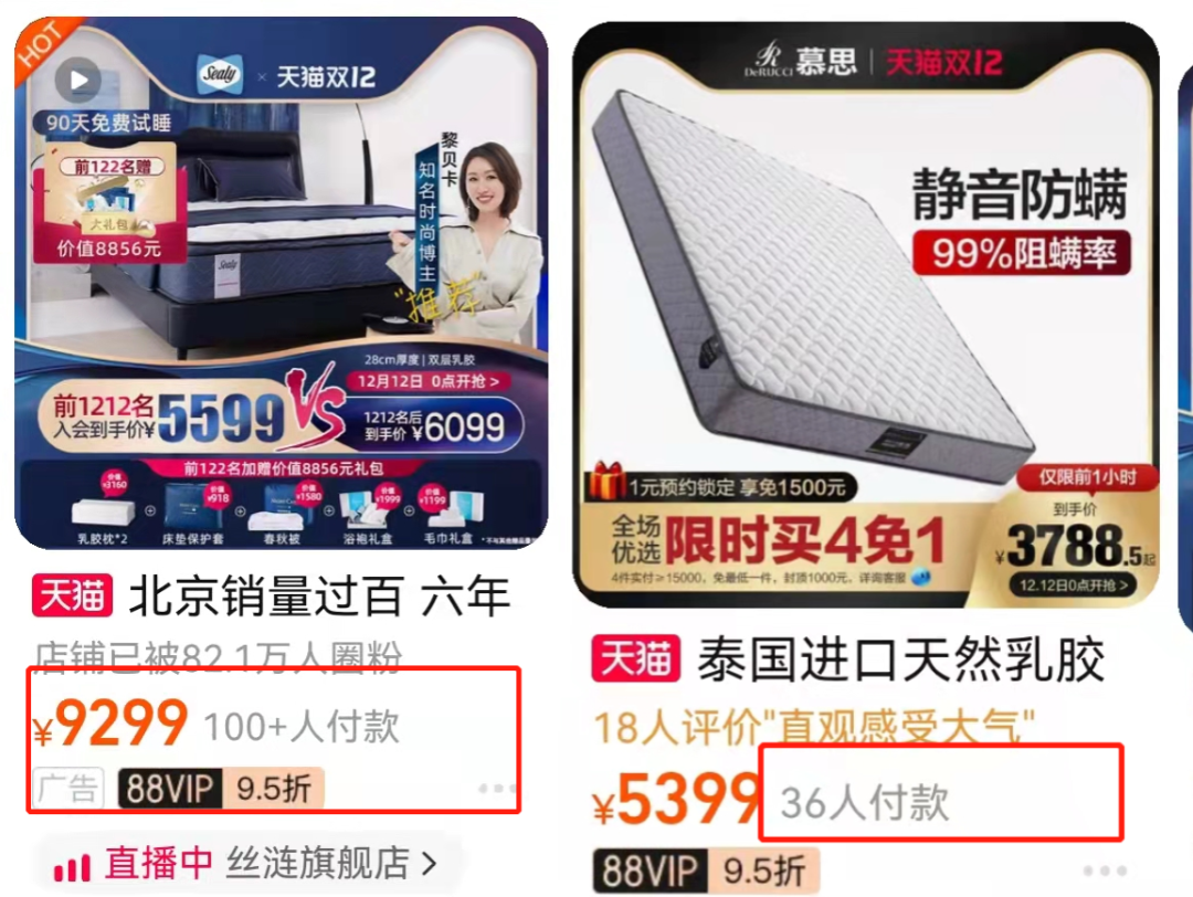 从天猫页面来看,慕思的5399元床垫,只有36人付款,但隔壁的丝涟,9299元床垫销量100+。