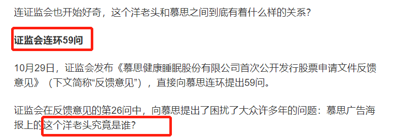 然而已经自称是行业第一的慕思床垫,却被证监会提出质疑,问题高达59个,其中最有争议的是:广告中使用的“洋老头”究竟是谁。