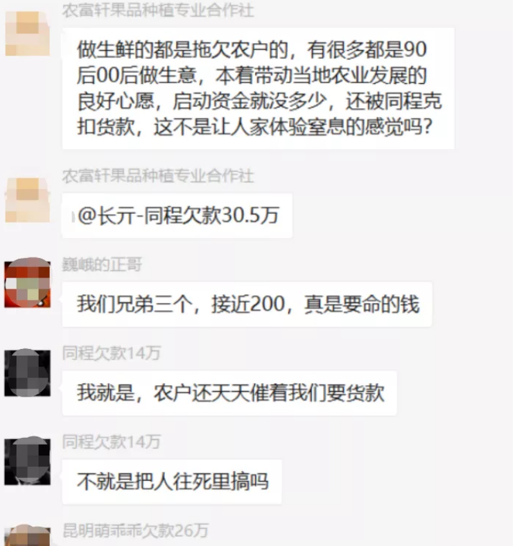 有供应商根据“同程讨债群”的接龙粗算,欠款高达6亿元左右。在这些群里,卖生鲜的、卖蔬菜的、卖日用品的,都变成了统一的名字“同程欠款14万”、“欠款26万”。