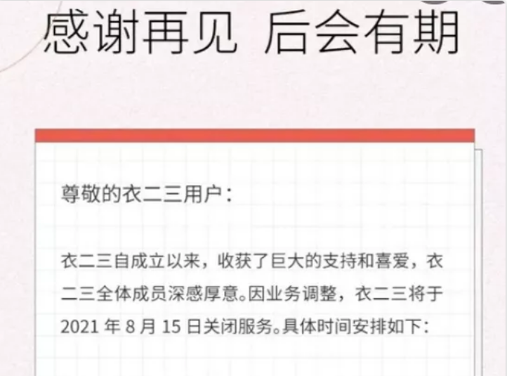 2021年8月15日,一款共享衣橱app“衣二三”,永久关闭了服务。