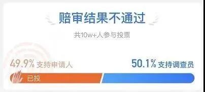 更有甚者,曾有赔审案例中,支持赔付比例49.9,不支持为50.1,极其接近的投票结果之下,平台没有专业人员介入,直接判定“不赔付”。