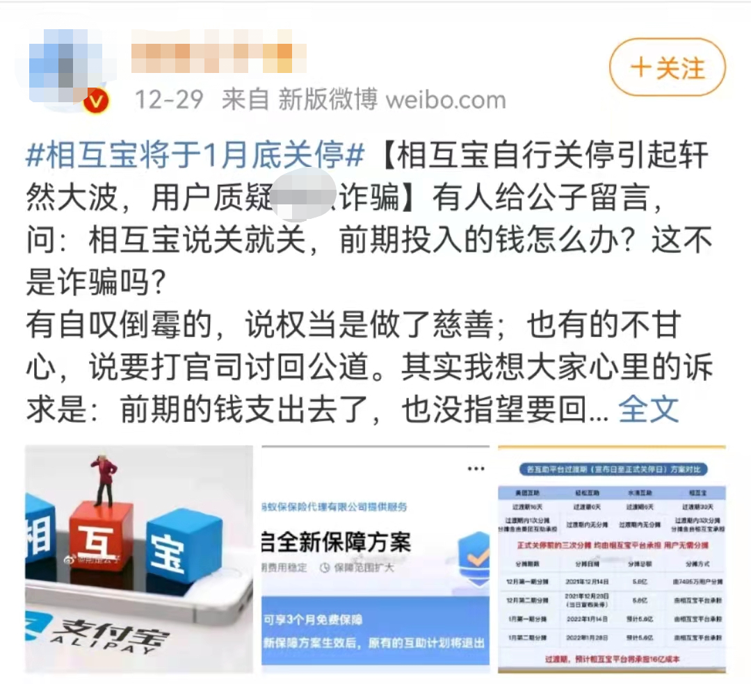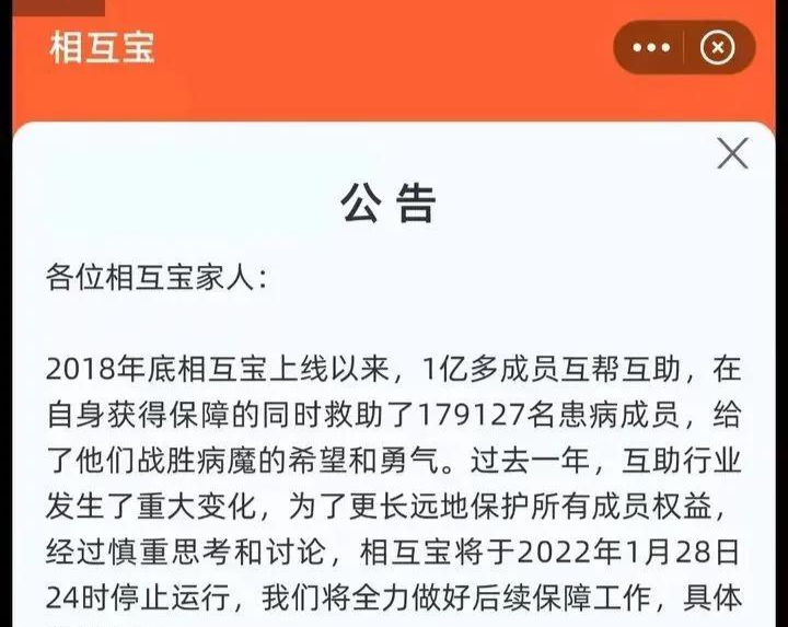 中国最大的网络互助平台“相互宝”发布公告:一个月后正式关停。