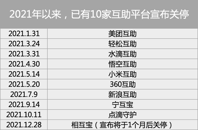 今年3-5月,腾讯旗下的轻松互助、水滴互助、小米互助也都相继关停。