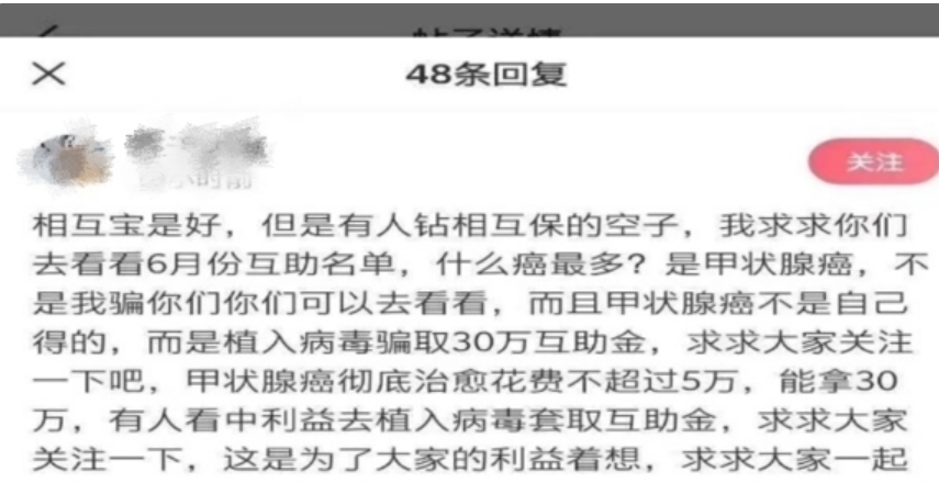 有用户提出猜测:“为什么甲状腺癌这么多?因为不是自己得的,而是病毒植入的”、“互助金领的是30万,完全治愈三四万就能搞定,剩下的钱去哪了?”