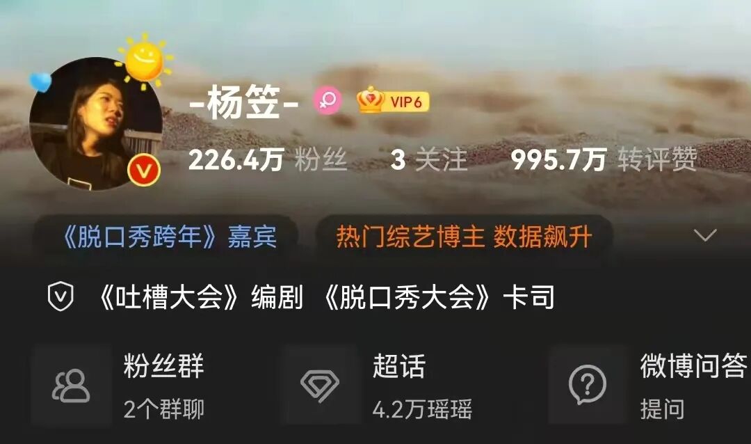 如今杨笠的微博粉丝226.4万,超话粉丝4.9万,《脱口秀大会4》大王周奇墨的微博粉丝数,只是她的零头。