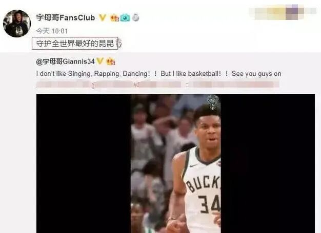 NBA球星“字母哥”还改编蔡徐坤的原话,发文调侃:“我不喜欢唱歌、说唱、跳舞,但是喜欢篮球。”