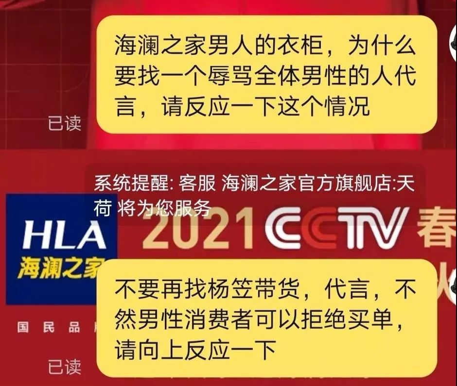 有人到海澜之家的电商平台,对客服投诉杨笠:不换掉杨笠,就一直下单一直退货。