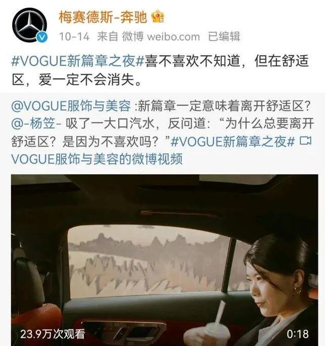 2021年10月14日,奔驰官方转发了一条以杨笠为主角的宣传短片,短片中的杨笠说:“走出舒适区,是因为不喜欢吗?”