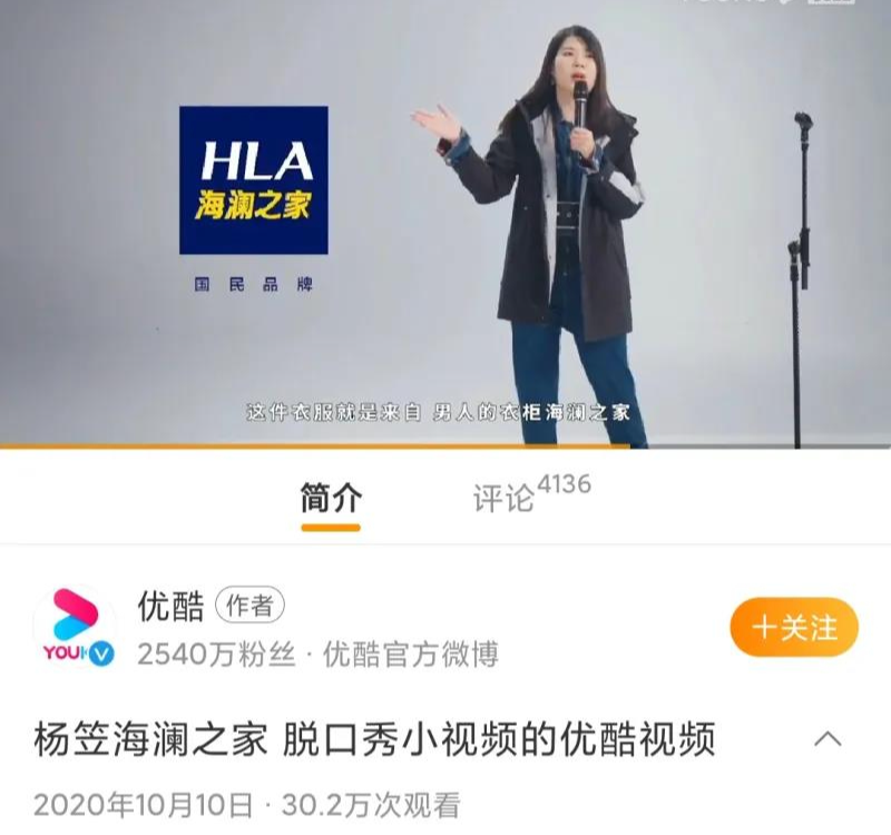 2020年10月,杨笠为海澜之家做了一场脱口秀直播,引发网友热议。