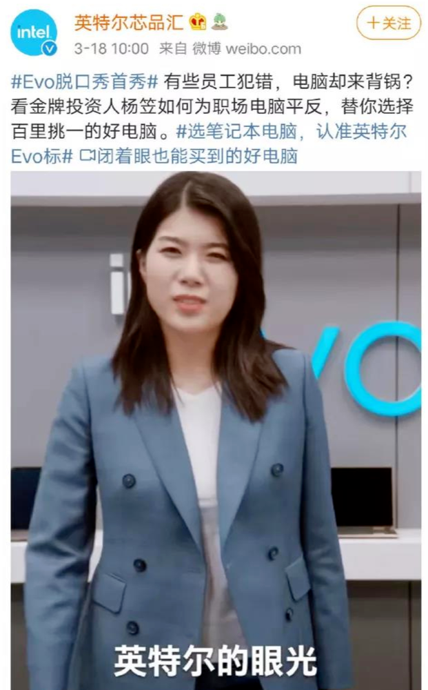 英特尔发布了一则动态,海报中杨笠说:“英特尔的眼光太高了,比我挑对象的眼光都高。”